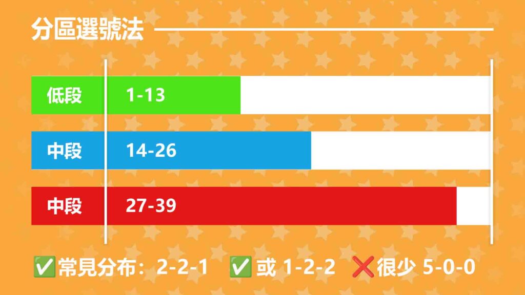 你會發現 539 不太會出現「五顆全都卡在同一區」的情況。通常會分布在兩到三段裡。所以每次選號時,小編會先看上一期的分佈,若某區連續兩期完全沒出,就很值得補位。