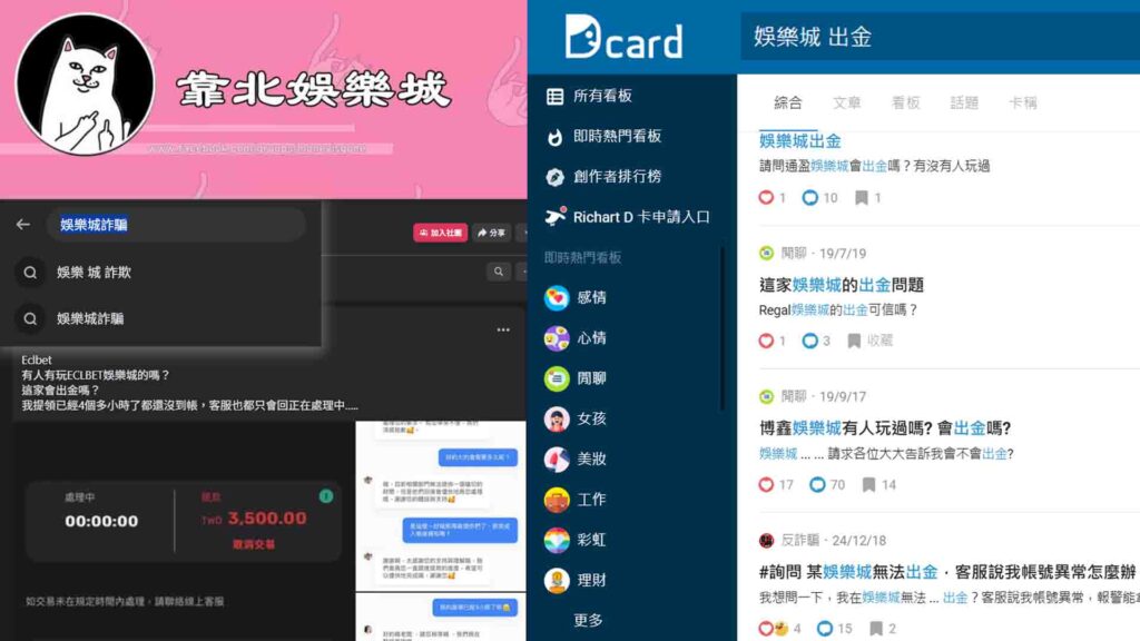 別傻傻只看娛樂城代理寫的推廣文,廣告當然都說自家是最棒的。但最可靠的評價,要看玩家怎麼說。小編習慣在 Dcard或臉書社團搜尋關鍵字,例如「XX娛樂城 詐騙」、「XX娛樂城 出金」,馬上就能看到有人分享被凍結帳號、出金卡關、甚至被黑網騙錢的經驗。