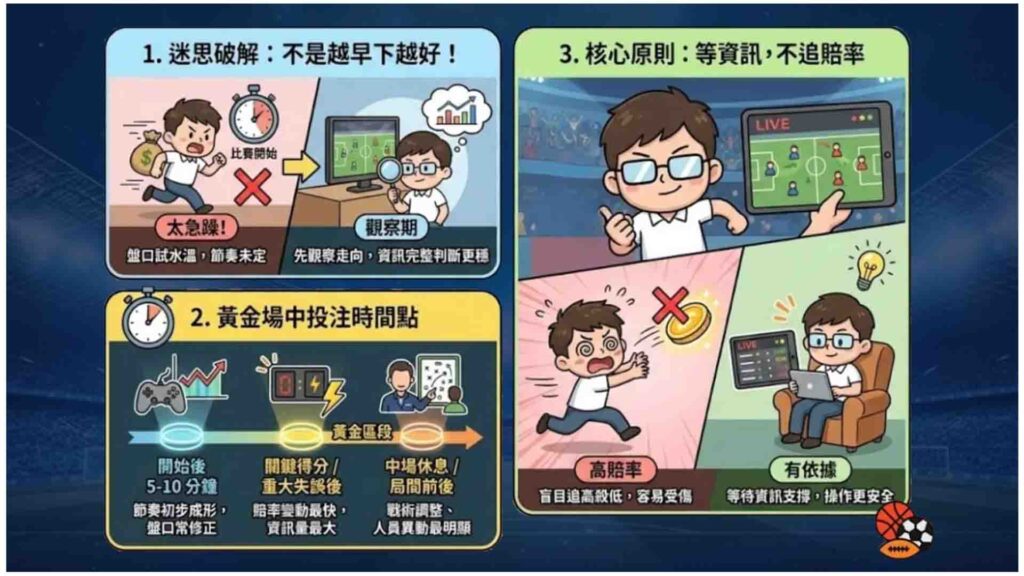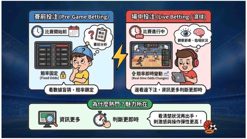 所謂場中投注,簡單講就是「比賽進行中還能下注」。它最大的魅力,就在於你能根據當下比賽的變化,動態調整你的下注策略。