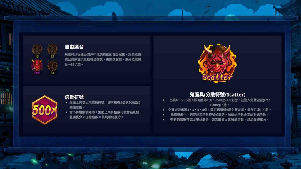 再來就是聲效設計也不馬虎,連爆分的時候都會有獨特的劍聲和忍術音效,真的讓人忍不住想一直轉下去。特別是鬼面具圖案一出現,立刻進入免費遊戲模式,那個音效真的會讓你熱血沸騰!