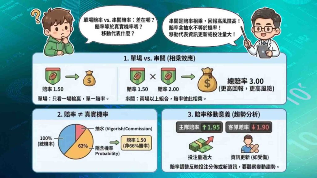A:小編建議先用「勝率換算」的方式,看看賠率代表的隱含機率,再對照你自己對比賽的理解,找出不合理的地方。